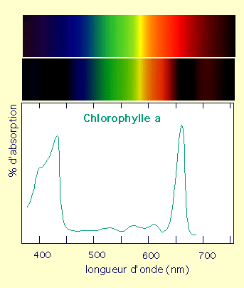| fig. 02 : Spectre d'absorption de la chlorophylle a. De haut en bas : spectre coloré de la lumière blanche, spectre coloré d'absorption de la chlorophylle a, spectre d'absorption obtenu au spectrophotomètre. |