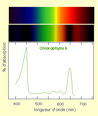 Conclusion : La chlorophylle b absorbe fortement à 445 nm (bleu) et 645 nm (rouge).
