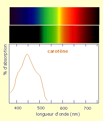 | fig. 04 : Spectre d'absorption des carotènes. De haut en bas : spectre coloré de la lumière blanche, spectre coloré d'absorption des carotènes, spectre d'absorption obtenu au spectrophotomètre. |
