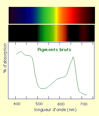 Le mélange de pigments bruts absorbe principalement dans le bleu (< 450 nm) et le rouge (650-670 nm).
