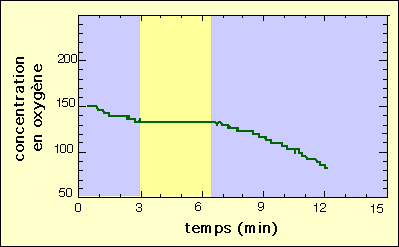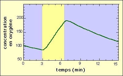 Cette expérience est réalisée par polarographie. La cuve de l'oxygraphe est remplie de chlorelles, algues vertes unicellulaires, ou de fragments de feuilles d'élodée. Réalisons une séquence obscurité/lumière/obscurité dans un milieu sans CO2, par exemple dans de l'eau distillée.