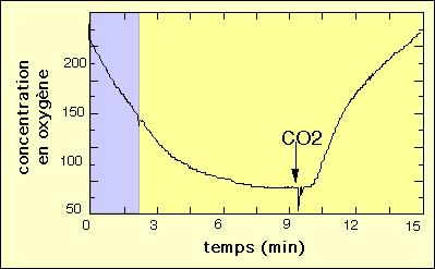Pendant la période d'obscurité, la concentration en dioxygène diminue (consommation de dioxygène due à la respiration) et pendant la période lumineuse, la concentration reste stable. Il n'y a pas de production nette de dioxygène en absence de CO2, même sous un éclairage optimal. Sans source de carbone, la photosynthèse dépend essentiellement de la production de CO2 par la respiration. La photosynthèse brute est alors égale (ou inférieure) à la respiration (en valeur absolue). La photosynthèse nette est donc nulle.