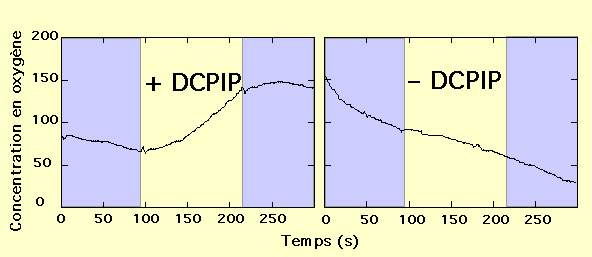 On peut compléter cette expérience par polarographie. A l'aide d'un oxygraphe, lors d'une séquence obscurité-lumière-obscurité, on enregistre les variations de concentration en dioxygène en présence ou non de DCPIP. Cette expérience est réalisée en absence de toute source de carbone.