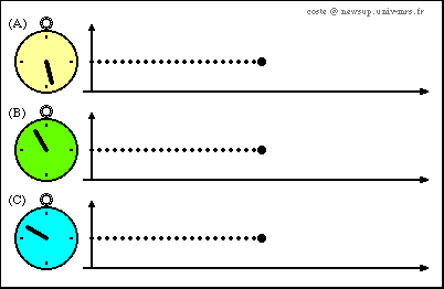 La simulation suivante montre un mouvement rectiligne uniforme correspondant à un galiléen muni de la chronologie privilégiée, mais avec des horloges différentes.