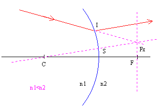 L'animation suivante permet de déterminer le rayon réfracté correspondant à un rayon incident quelconque sur un dioptre sphérique: